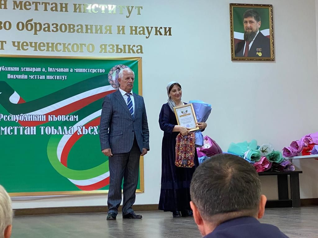 19.05.2023На базе Института чеченского языка состоялось награждение победителей, участников, а также членов жюри конкурсов и состязаний, прошедших в рамках Года чеченского языка.Благодарственным письмом за активное участие в составе жюри конкурсов была награждена Шахтиева Роза Ахмедовна, учитель чеченского языка и литературы МБОУ «Гимназия № 14».Свою награду она получила лично от директора Института чеченского языка, доктора филологических наук, Овхадова Мусы Рукмановича.