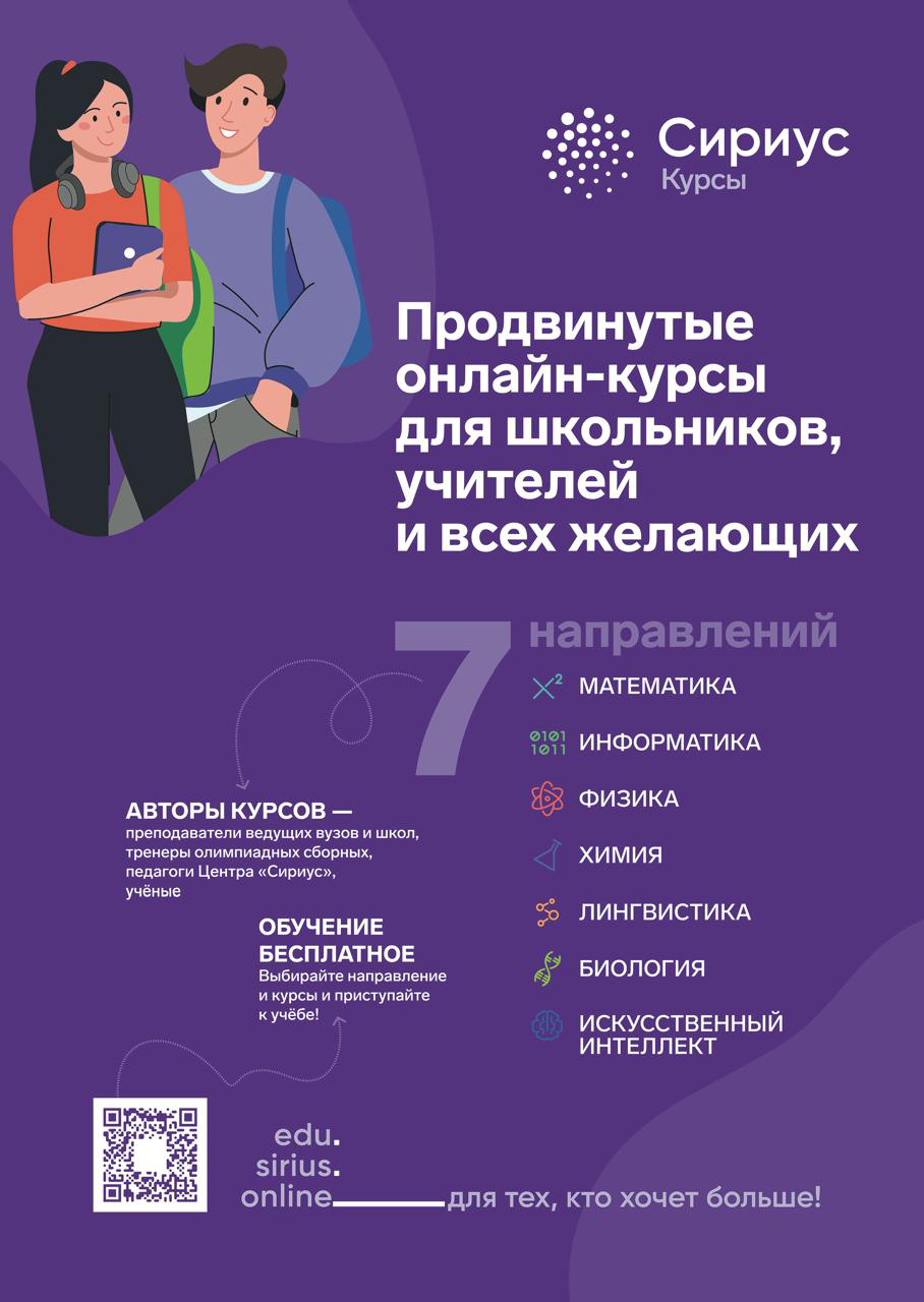 Продвинутые курсы для школьников, учителей и всех желающих. Если вы уверенно знаете школьную программу и хотите изучать предметы углублённо — присоединяйтесь к Сириус.Курсам.