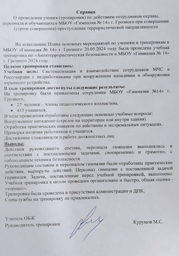 В МБОУ «Гимназия №14» г. Грозного провели учения (тренировки) по действиям сотрудников охраны, персонала и обучающихся МБОУ «Гимназия Nº 14» г. Грозного при совершении (угрозе совершения) преступления террористической направленности. Ниже представлена справка.