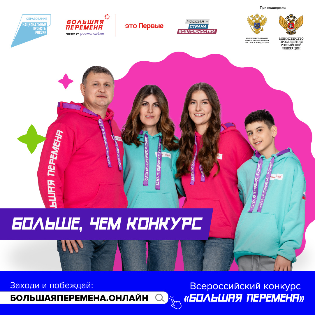 12 апреля стартовал пятый (юбилейный) сезон Всероссийского конкурса «Большая перемена» – самого масштабного проекта для детей и подростков в России. Регистрация участников открыта на платформе (вставить UTM-Метку вашего региона) до 20 мая 2024 года.