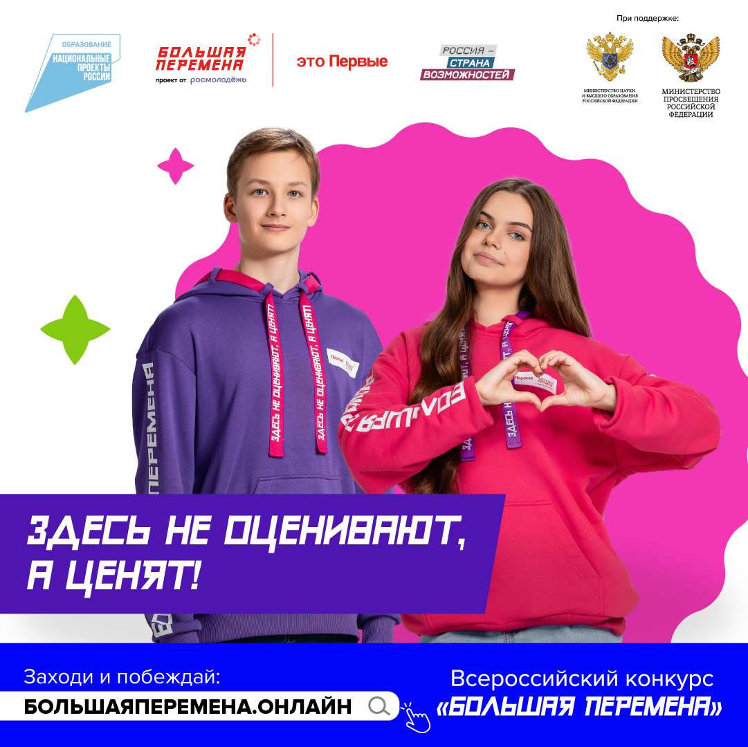 Конкурс «Большая перемена» – флагманский проект Движения Первых. Соорганизатором выступает Федеральное агентство по делам молодёжи (Росмолодёжь). Конкурс входит в линейку президентской платформы «Россия – страна возможностей». «Большая перемена» проводится при поддержке Министерства просвещения РФ и Министерства науки и высшего образования РФ.