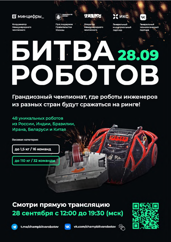 27.09.2024Мин цифры России в соответствии с распоряжением Правительства РоссийскойФедерации от 11 апреля 2023 г. № 889-р сообщает о старте нового сезонаМеждународного чемпионата по битве роботов (далее - Чемпионат), которыйспособствует продвижению инженерной мысли как драйвера развития и поддержкисовременных цифровых технологий.Впервые в 2024 году Чемпионат пройдет по двум дисциплинам:«Битва роботов» для участников всех возрастов с роботом весом до 110 килограмми новая дисциплина «Битва мини-роботов» для участников 10-17 лет с роботом весомдо 1,5 килограмм.Первый отборочный этап Чемпионата пройдет 28 сентября 2024 г.при поддержке Правительства Москвы на территории спортивного комплекса«ЦСКА Арена» (далее - мероприятие). Участники первого этапа - 48 командиз России, Беларуси, Бразилии, Индии, Ирана и Китая. Программой мероприятияпредусмотрено два шоу: дневное (с 12:00 до 15:20) и вечернее (с 17:00 до 19:20).